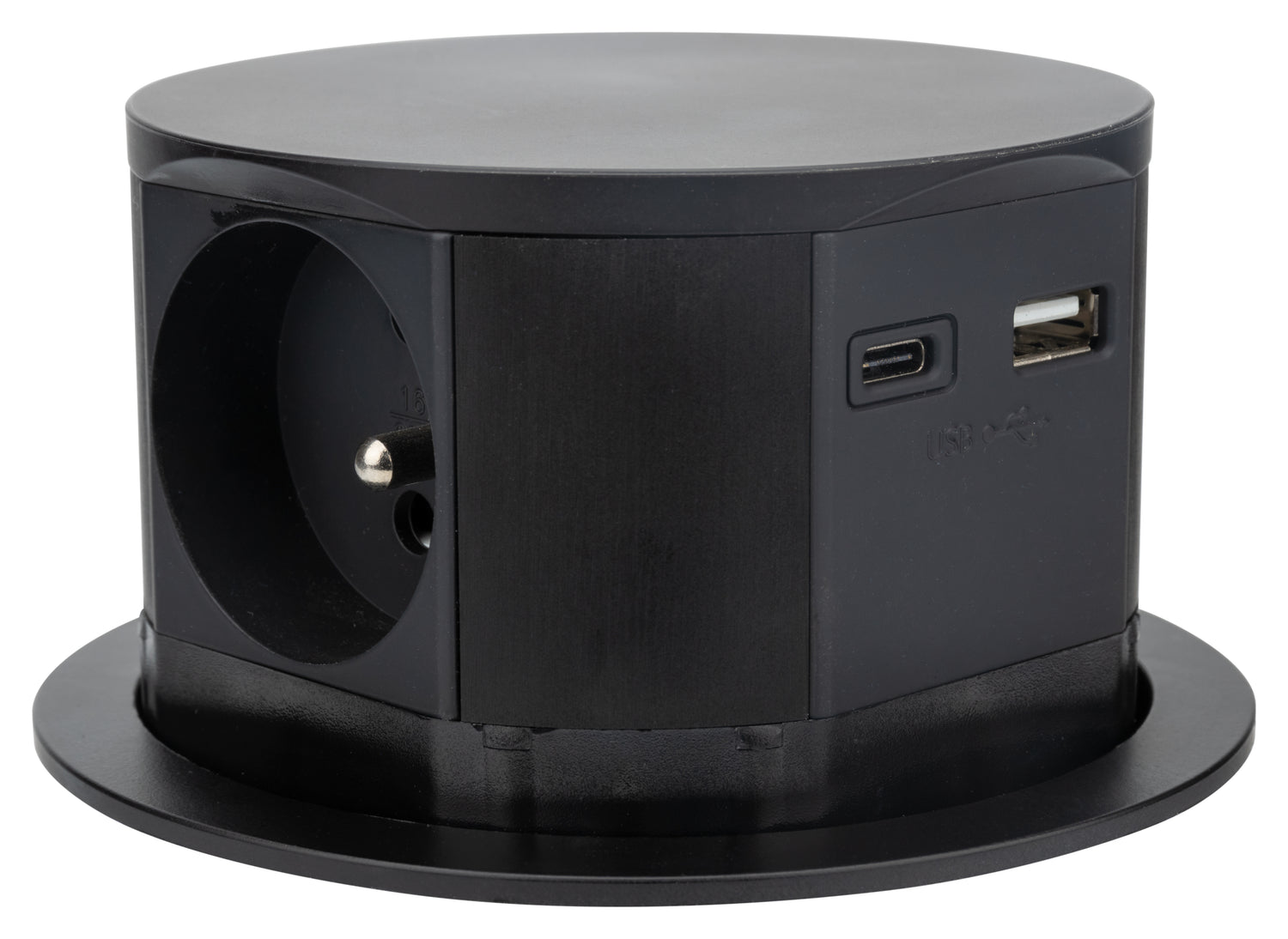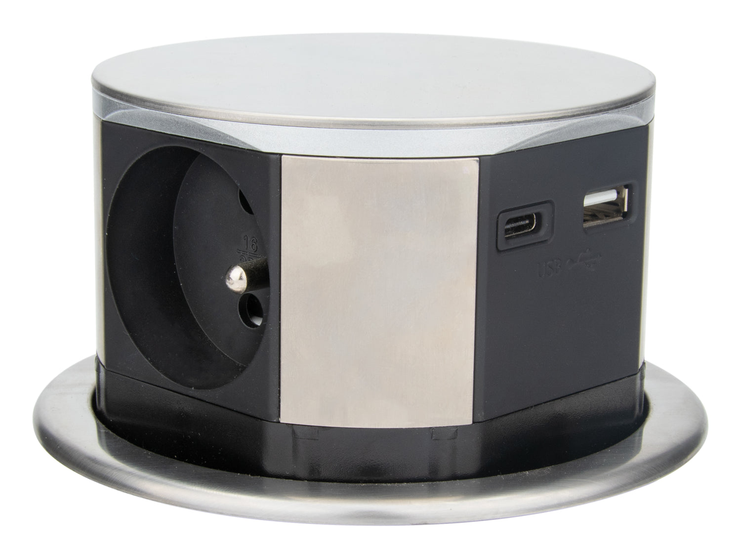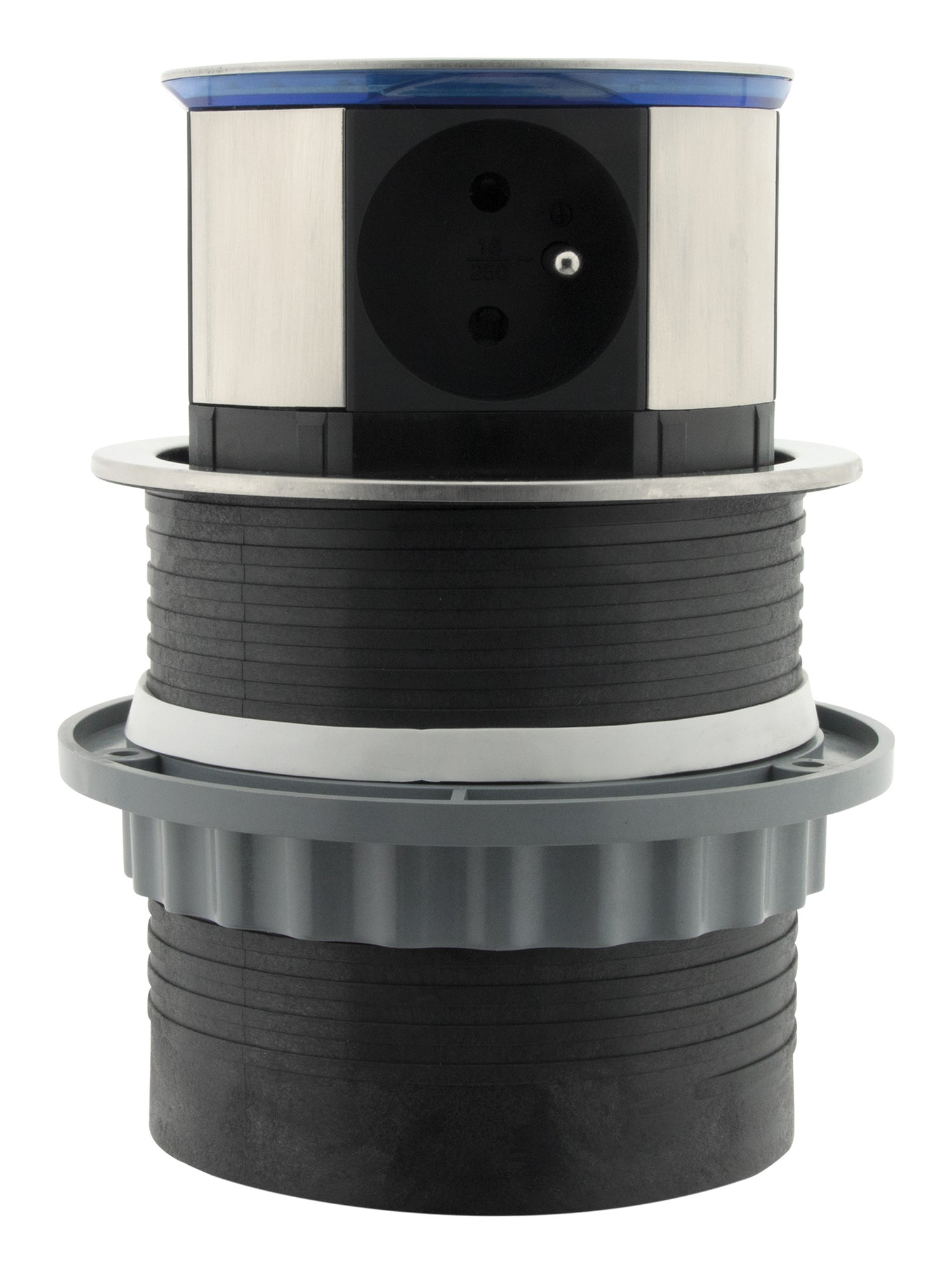 L'installation de ce bloc escamotable nécessite de percer un trou sur le plan de travail ou le bureau à l'aide d'une scie cloche ou d'un trépan adapté à son matériau et d'un diamètre de 100mm.