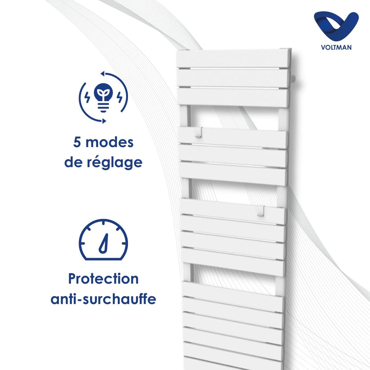 Caractéristiques du radiateur sèche-serviette électrique 1000W et soufflant 750W blanc - barres plates - Voltman :