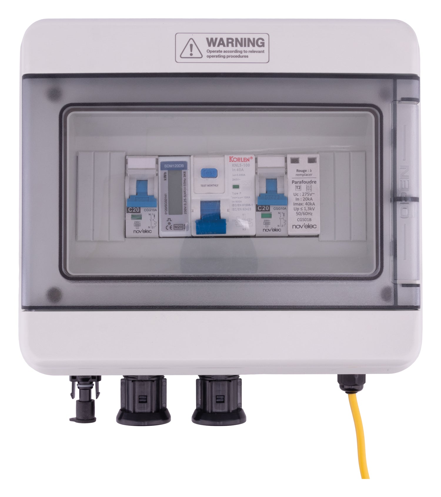 Les accessoires modulaires câblés en H07V-K offrent une installation fiable et durable. Grâce à son affichage LCD 6 digits, il permet un suivi précis de la consommation énergétique. Conforme aux normes NF et EN 61643-11, il répond aux exigences de sécurité et de performance pour une installation photovoltaïque optimisée.