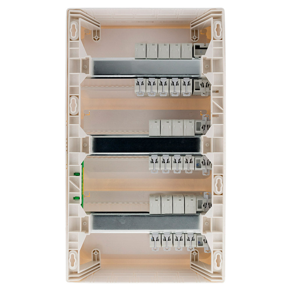 Ce coffret inclut tous les éléments nécessaires pour une gestion simplifiée des circuits électriques, comme des obturateurs, un bornier de terre, des portes, des étiquettes de repérage des circuits et des pictogrammes pour un marquage clair.