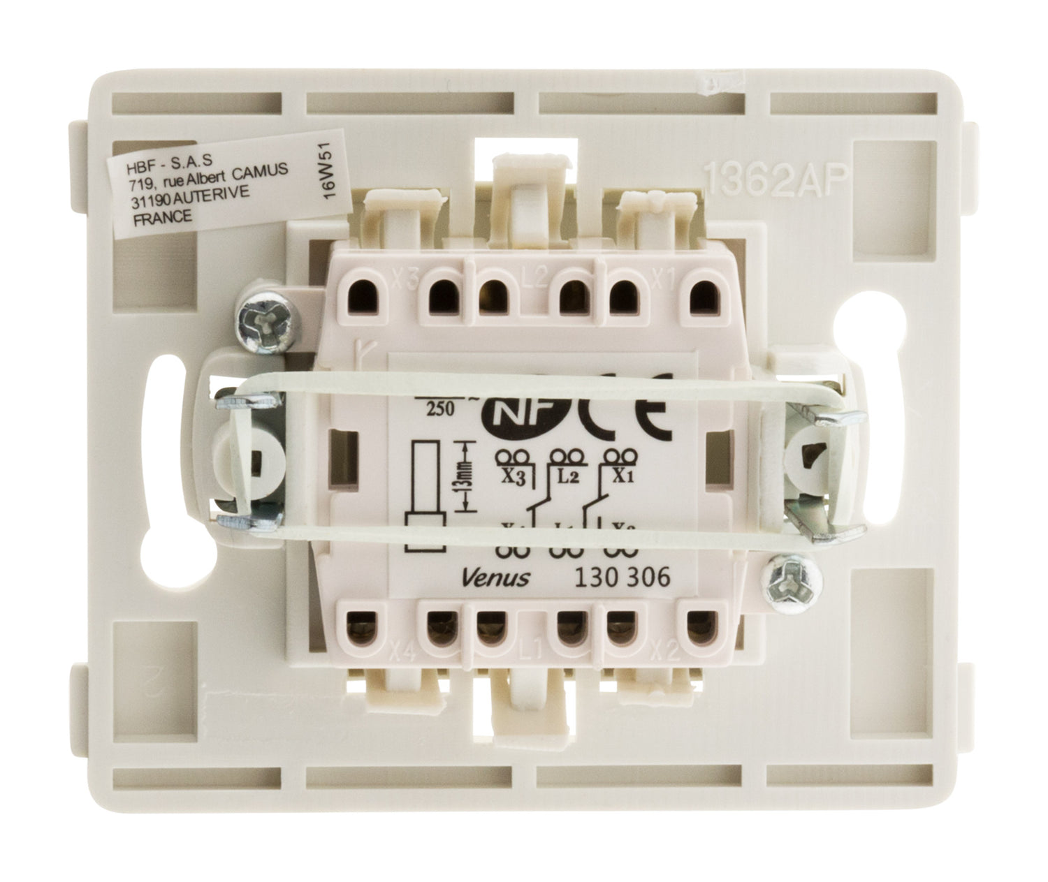 Caractéristiques de l'interrupteur double va et vient blanc 10A à bornes automatiques - Zenitech :