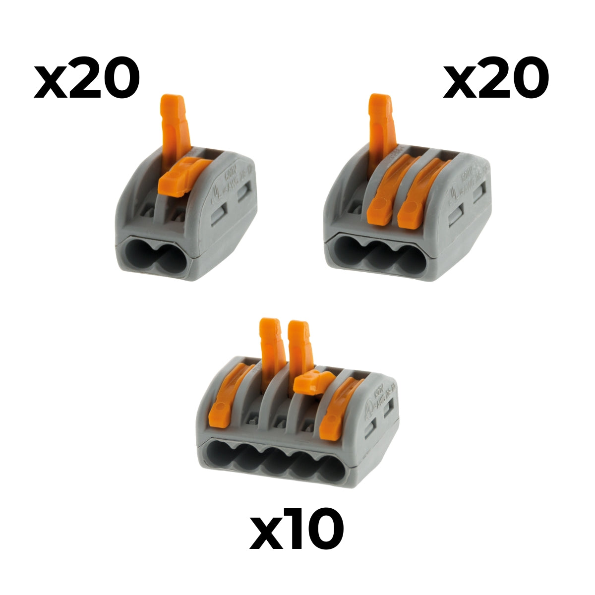 La longueur de dénudage recommandée de 9 à 10 mm assure un contact optimal et une installation stable. Disponible en lots de 20 ou 50 unités, ce produit offre des configurations variées selon vos besoins : 5 bornes à 2 entrées, 10 bornes à 3 entrées et 5 bornes à 5 entrées pour le lot de 20, ou 20 bornes à 2 entrées, 20 bornes à 3 entrées et 10 bornes à 5 entrées pour le lot de 50.