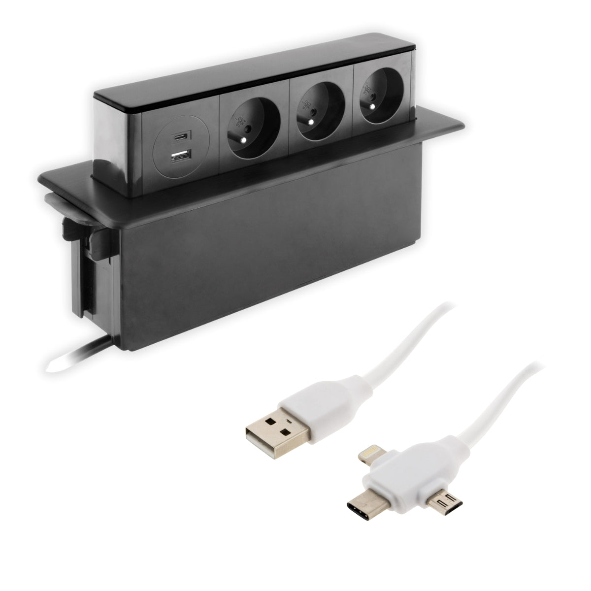 Cette multiprise encastrable design vous donne la possibilité de brancher 3 appareils électriques en simultané tout en rechargeant votre smartphone ou votre tablette de manière rapide. Conçue pour optimiser l'espace de travail et vous garantir un véritable gain de place, cette multiprise bénéficie de la technologie Quick Charge et s'intègre de manière discrète dans votre plan de travail. encastrable, elle disparaît dès que vous n'avez plus besoin de l'utiliser. C'est le branchement idéal dans une cuisine ou un bureau.