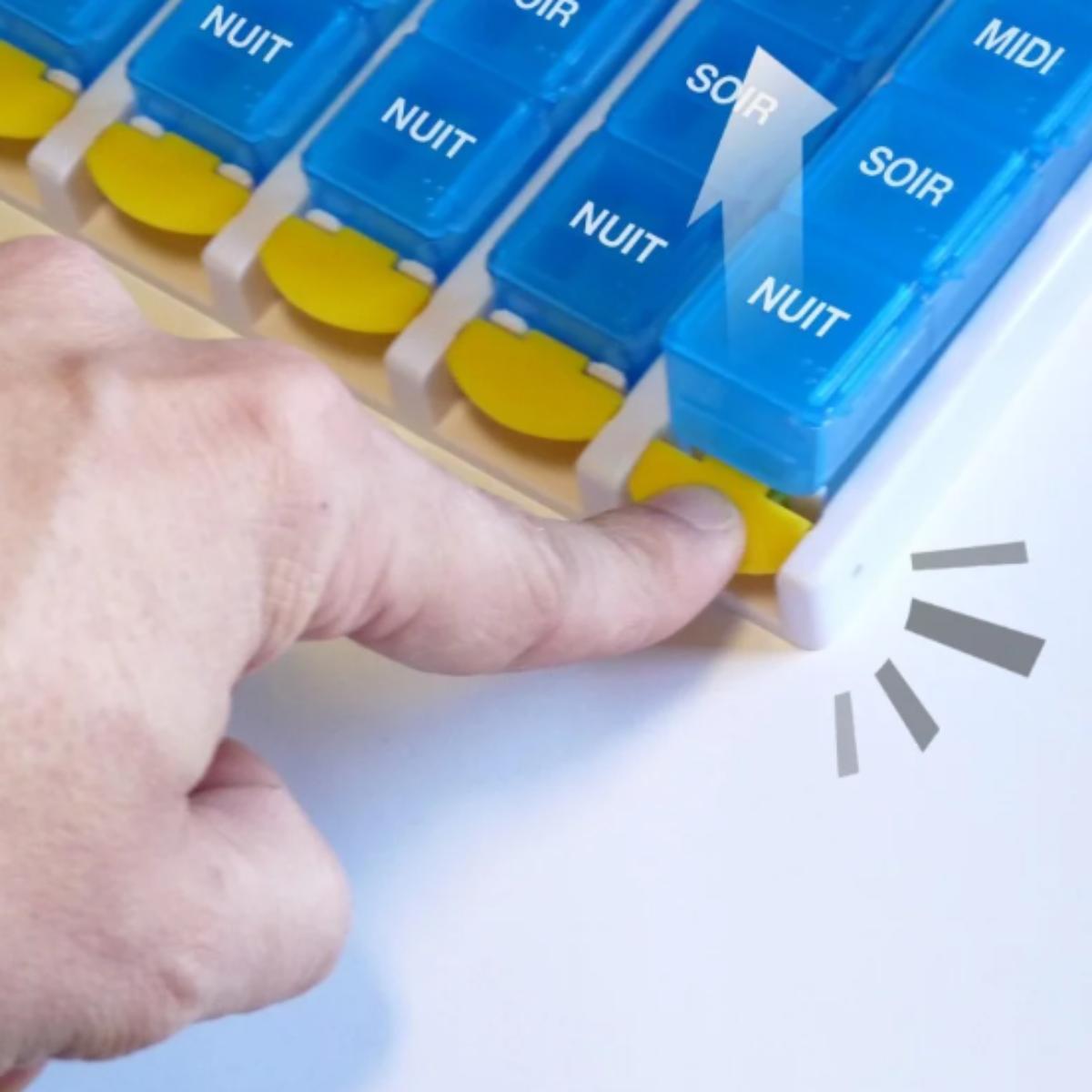 Chaque journée est répartie dans un boîtier individuel contenant quatre cases pour les différentes prises quotidiennes. Le bouton pressoir permet d'ouvrir un module sans effort, idéal pour les personnes ayant une mobilité réduite.