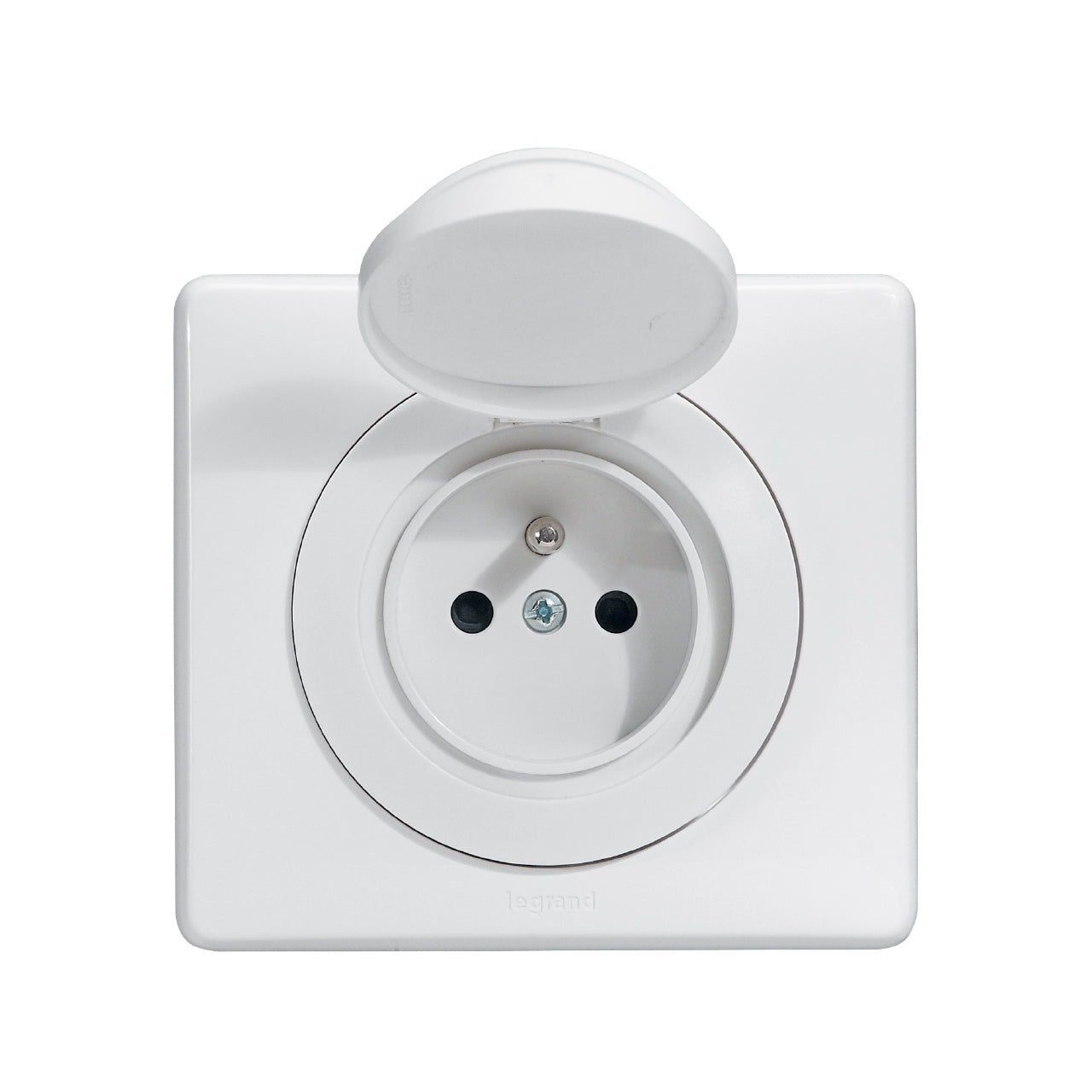 La prise de courant 2P+T 16A étanche complète Céliane assure une alimentation fiable et sécurisée dans les pièces humides ou pour les installations extérieures protégées