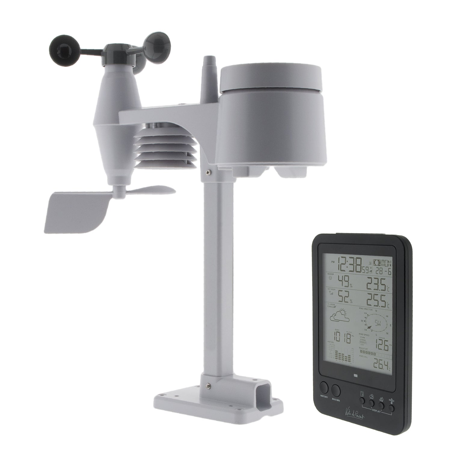 • Capteur extérieur qui calcule la vitesse et direction du vent, la pluviométrie, thermomètre et hygromètre