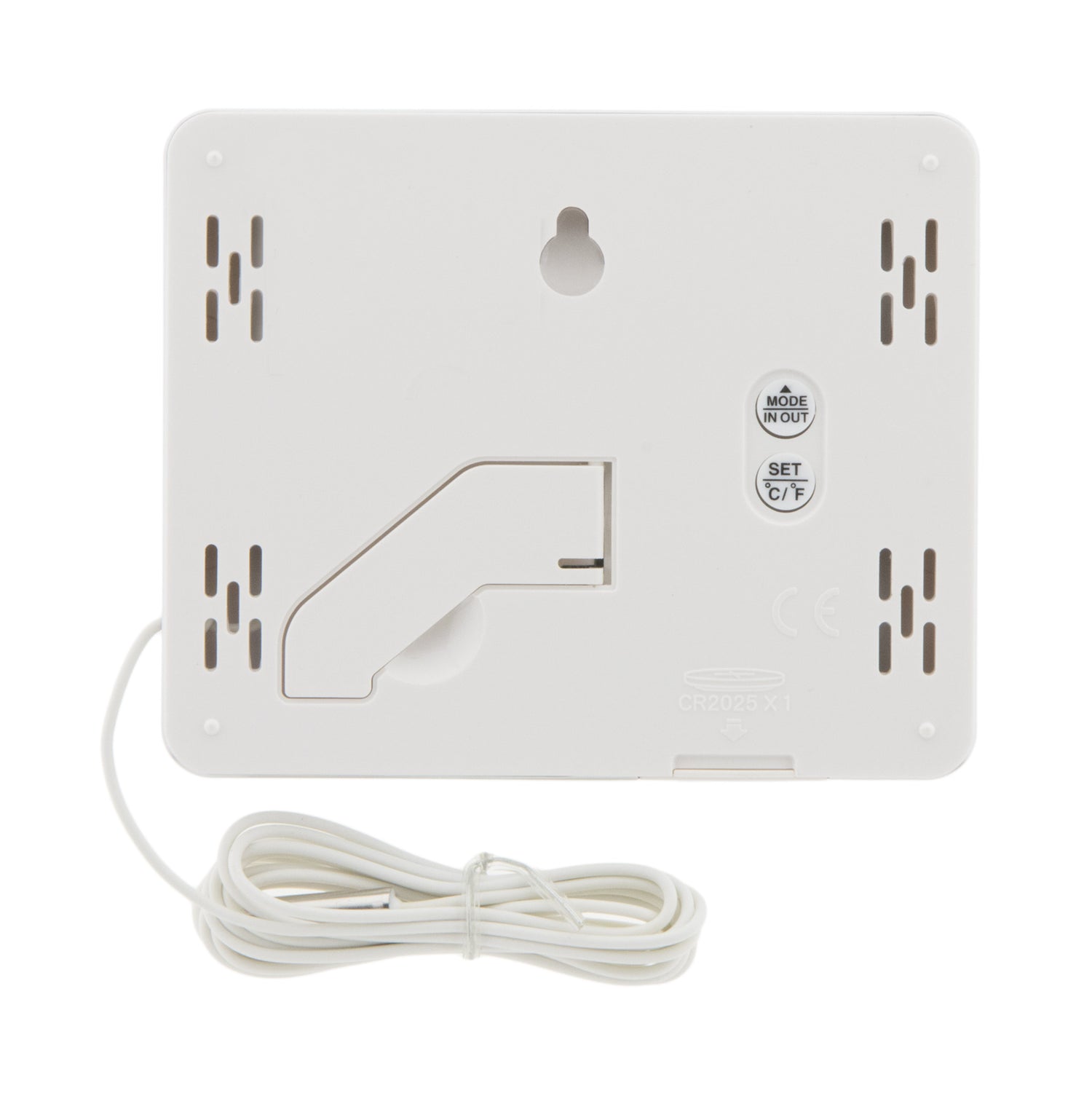 Ce thermomètre à poser ou à fixer au mur est équipé d'une sonde filaire. Il convient aussi bien pour une utilisation en intérieur qu'en extérieur. Il affiche d'ailleurs les deux températures : intérieure (0°C / 50 °C) et extérieure (-40°C / 70°C) sur son écran LCD.